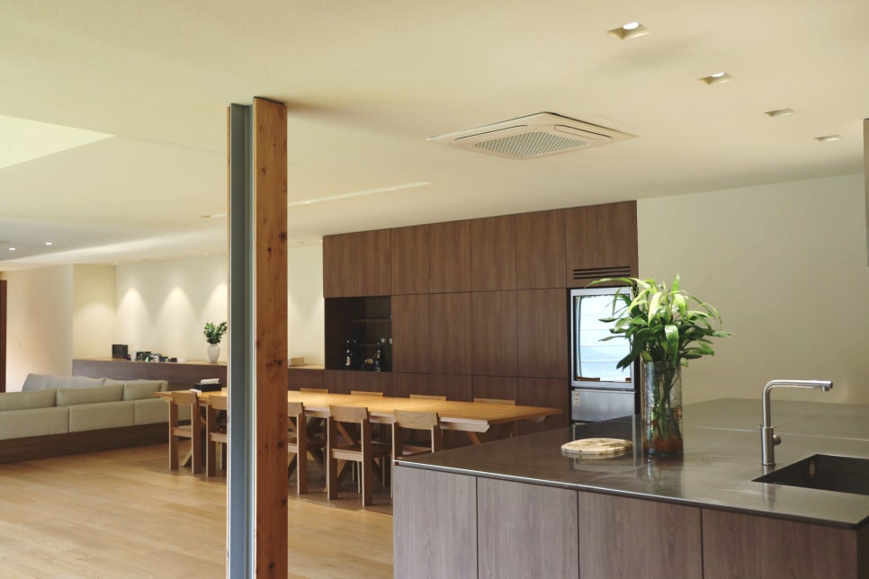 길다란 원목식탁 끝에는 심플세련된 소파가