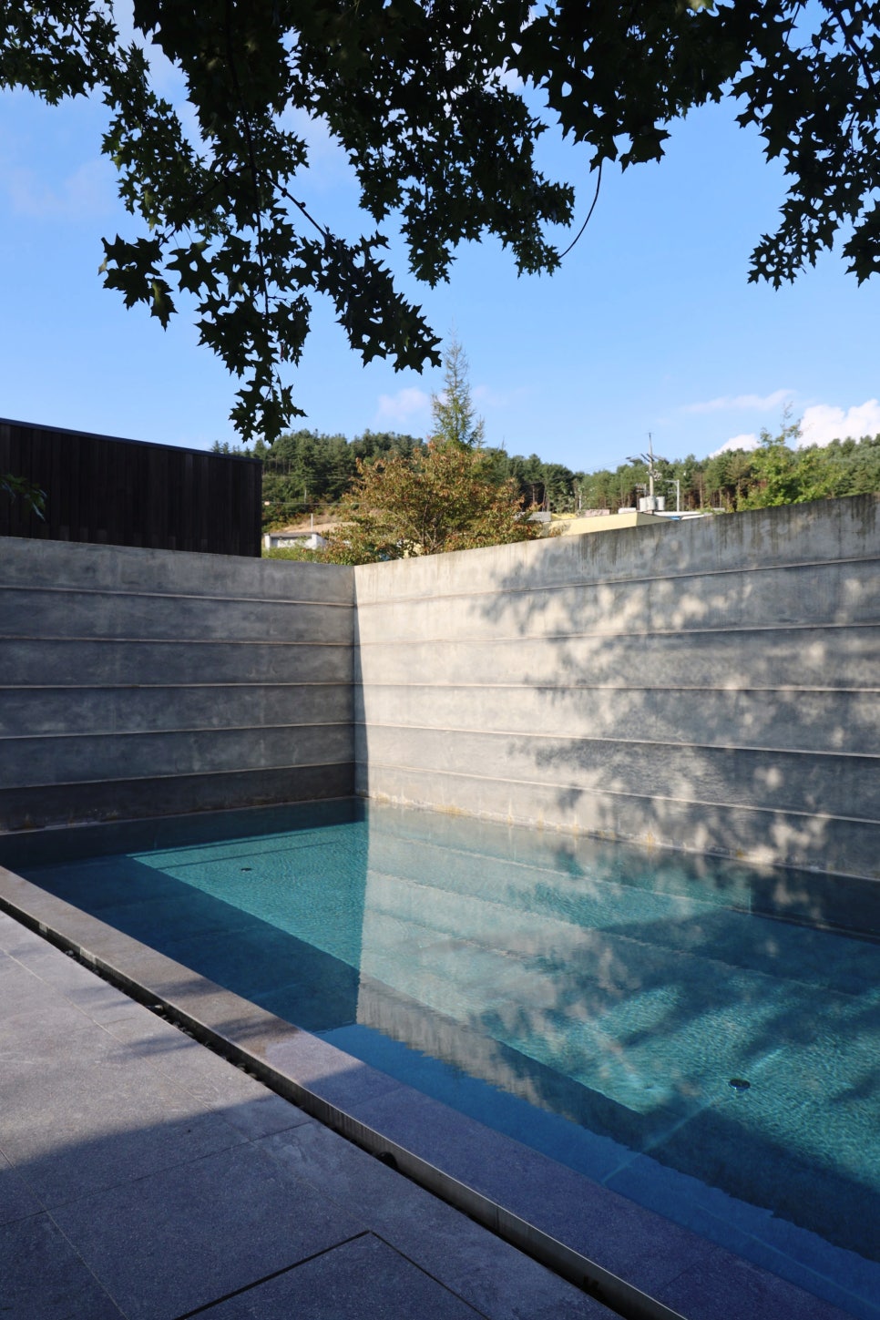 넓은 정원 한쪽에 자리하고 있는 길다란 수영장은